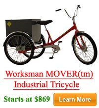 With today's escalating fuel cost, the need for aerobic conditioning and the desire to reduce fumes and lower costs, there has never been a better time to incorporate Worksman heavy duty bicycles and tricycles into your plans. Whether you are a facility manager at a Fortune 500 company that needs to haul cargo around a large factory, a small business that needs tricycles for local deliveries or an individual needing a specialty cycle for personal use, Worksman is the right choice. Many people are discovering Worksman specialty Tricycles such as our Side by Side Team Dual Trike, Worksman family chariot pedicab, WTX Trikes and PAV Personal Activity Vehicle as well as an array of bicycles and tricycles that cater to riders with special needs.